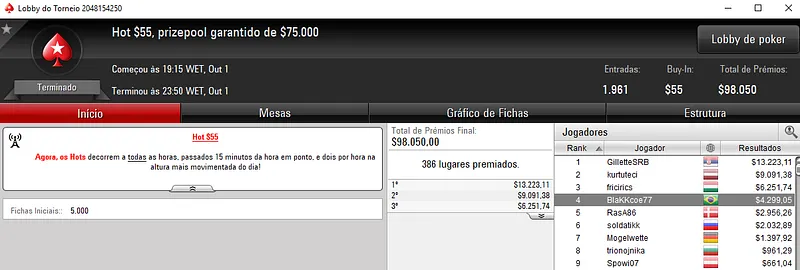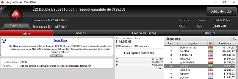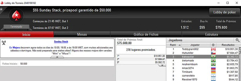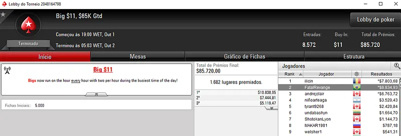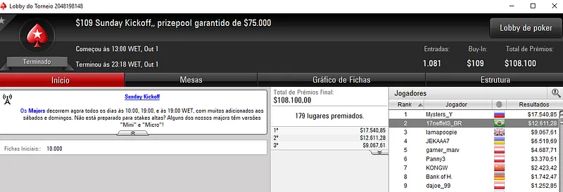 O terceiro maior prêmio brasuca foi garantido por fauzika1 ao cravar o $10,000 Payday. As 1,092 entradas não fizeram frente ao jogador brasuca que saiu do torneio com $13,620 de prêmio.