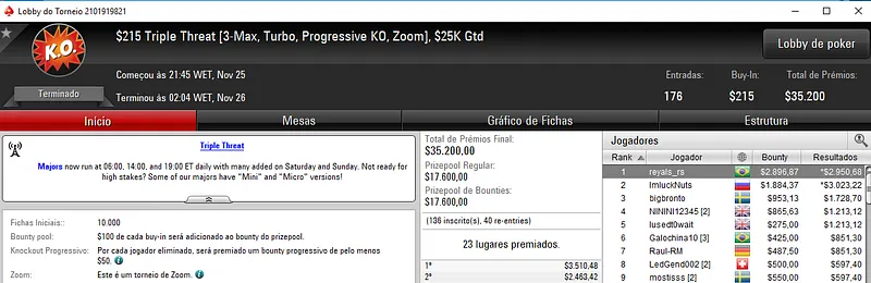 O torneio especial de sábado, o $215 Saturday Duel [Heads-Up, Turbo, Zoom, Progressive Total KO] teve 116 jogadores em prova e o "matador" de serviço foi arnonab que forrou $7,687 em KOs.