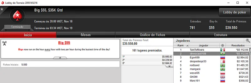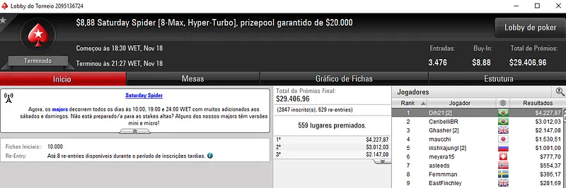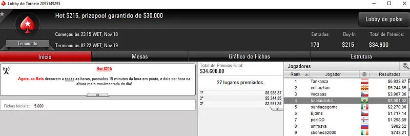 Já no $27 Saturday Eliminator [Progressive KO] com 4,817 jogadores, Leonardo "lforoni" Foroni levou para o caixa $5,155, depois de terminar o torneio no terceiro lugar. Este evento acumulou $118,257 de prize pool e os prêmios foram distribuídos pelos 584 melhores jogadores.