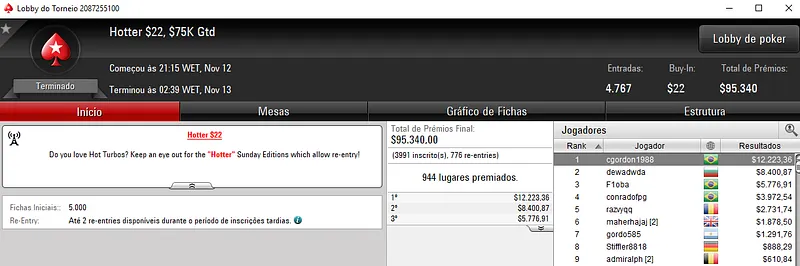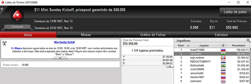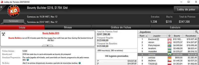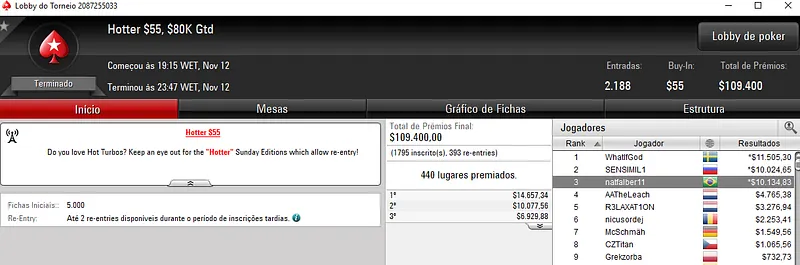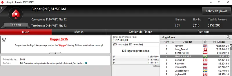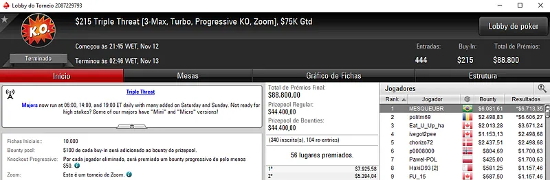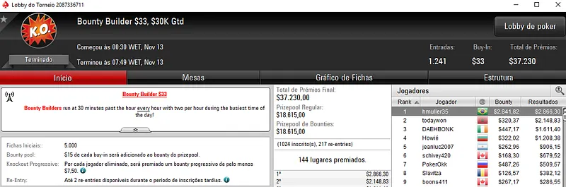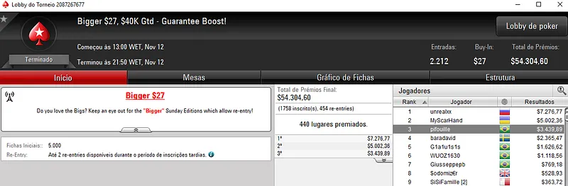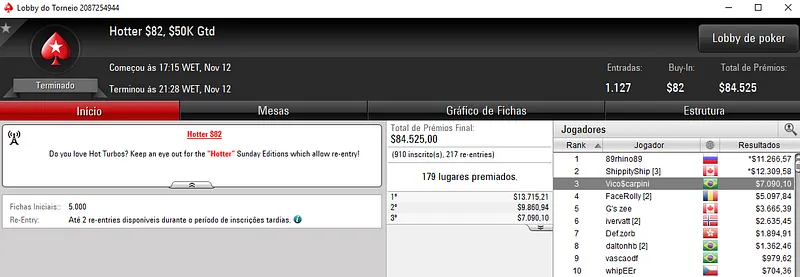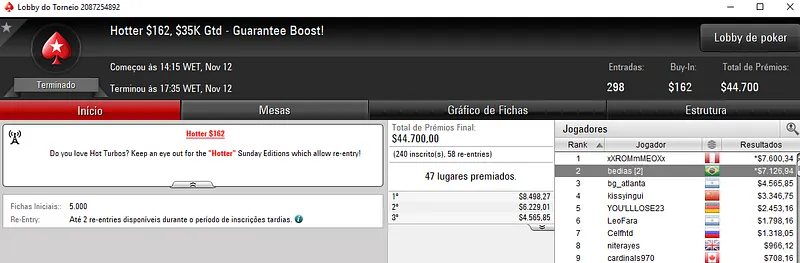 Já Victor "vitinhorrn15" Pedote trouxe a medalha de prata e $18,994 de prêmio no Bounty Builder $109. Com 3,142 participantes, este torneio teve um prize pool acumulado de $314,200.