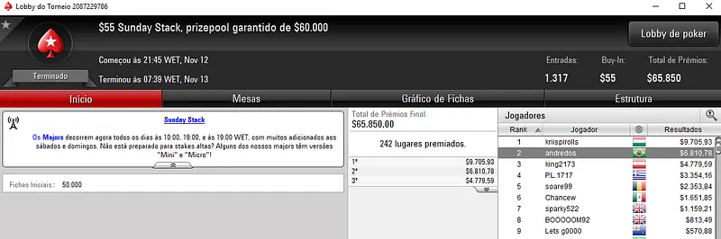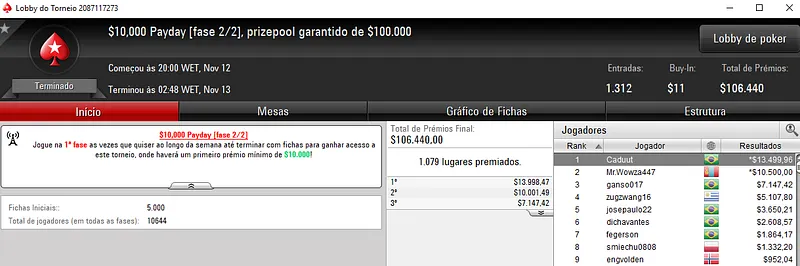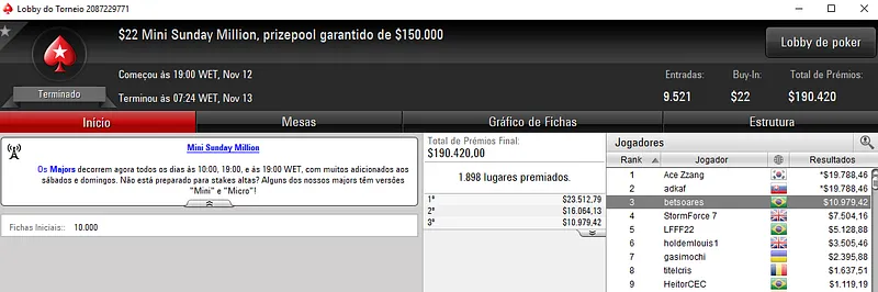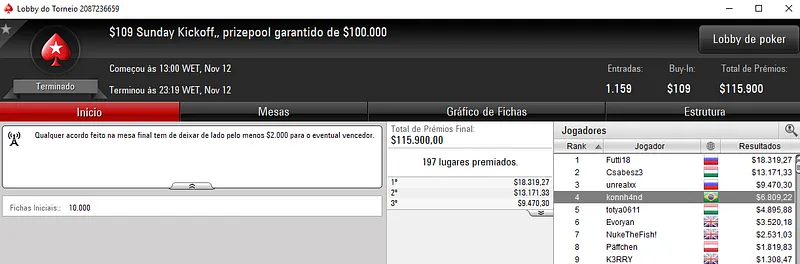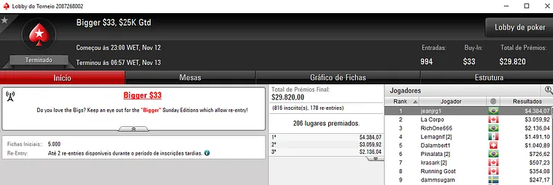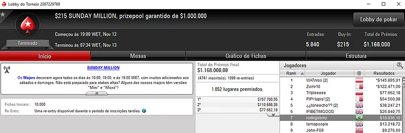 O field gigante do $11 Sunday Storm com 26,334 jogadores não assustou wjr1997 que embolsou $24,073 pela vitória. Este evento teve um prize pool acumulado de $263,340 com 5,084 jogadores a garantirem prêmio.