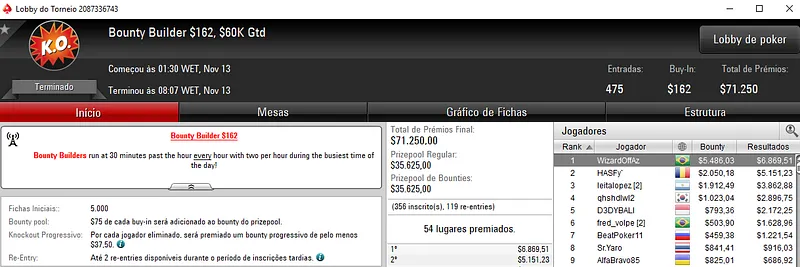 A principal conquista apareceu no $530 Bounty Builder High Roller com 1,041 jogadores. O torneio teve um prize pool de $520,500 e para o jogador brasileiro Gustavo "gustavo5454" Hoffman ficaram reservados $72,482 entre premiação e bounties.