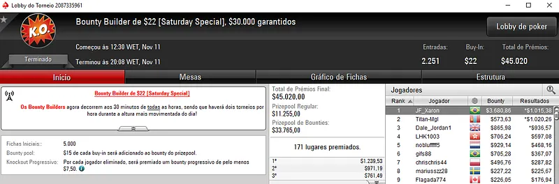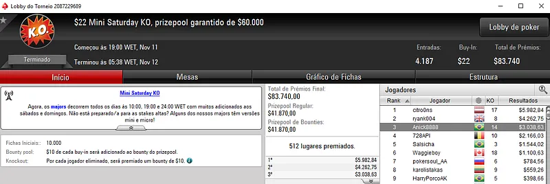 O maior desses feitos veio com a cravada de Léo82 no Big $22 com 2,305 jogadores. O torneio teve um prize pool de €46,100, distribuído pelos 458 melhores classificados. Para Léo82 ficaram reservados $6,140 depois de vencer Tr!pleeeee no heads-up.