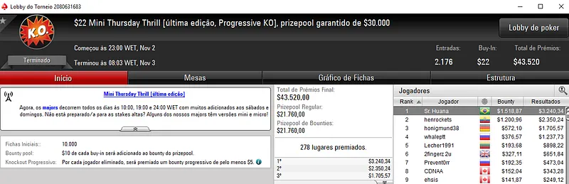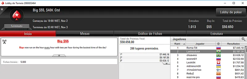Outra cravada apareceu o Hot $109 onde foram registradas 485 entradas. Guithome superou todo o field para embolsar $8,632 de premiação. O heads-up foi disputado contra o alemão Anton021973.