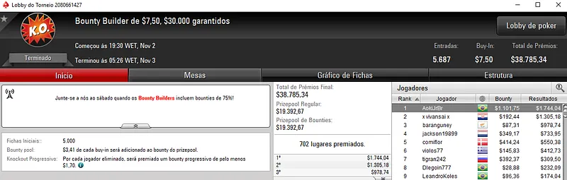 LetsFlipIt foi o nosso melhor representante ao cravar o Bounty Builder $55 com 1,307 jogadores. O torneio teve um prize pool de $65,350 e para o jogador brasuca ficaram reservados $10,034 entre prêmio e bounties.