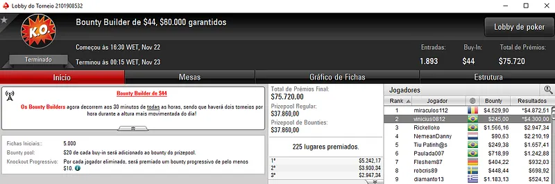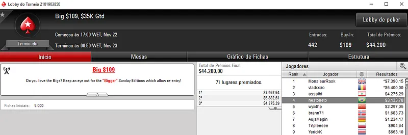 Com 1318 entradas, o Big $215 teve um prize pool de $27,600, onde 23 jogadores saíram premiados. O título ficou para o brasuca Drudz777 que forrou $5,750 de prêmio. Na terceira colocação, @tetaschell ainda levou para o caixa $3,249.
