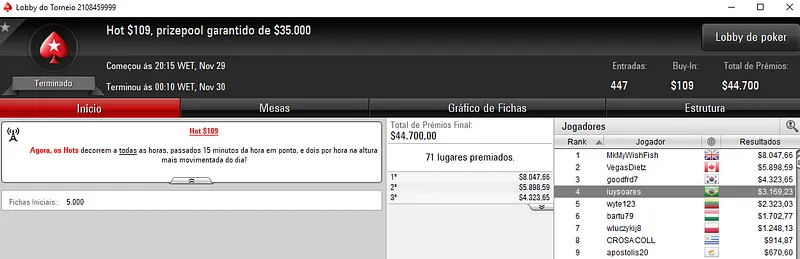 Para terminar, Francisco "chiconogue" Nogueira cravou o Hot $82 com 365 entradas e $27,375 de prize pool. Pelo eu tiunfo, Francisco levou para o caixa $5,001 de premiação.