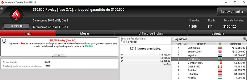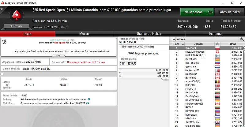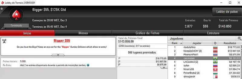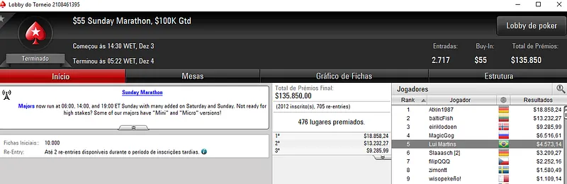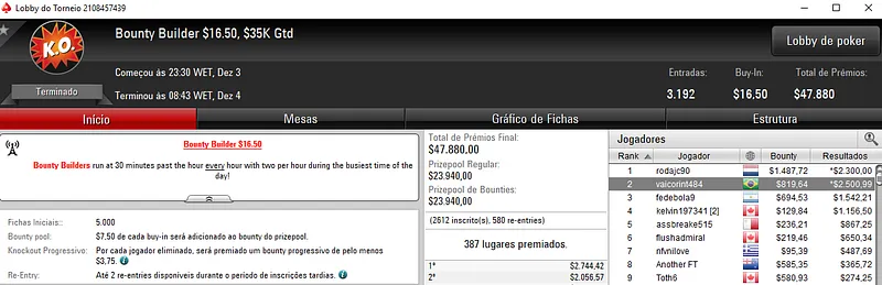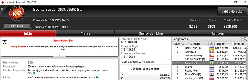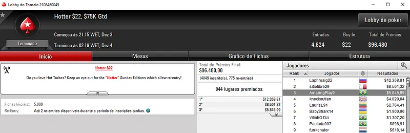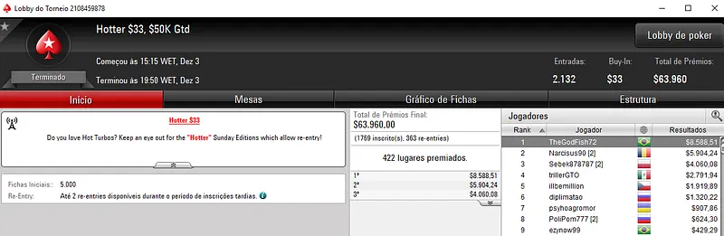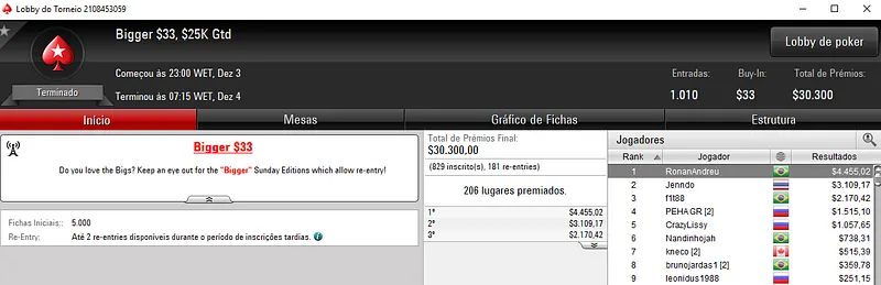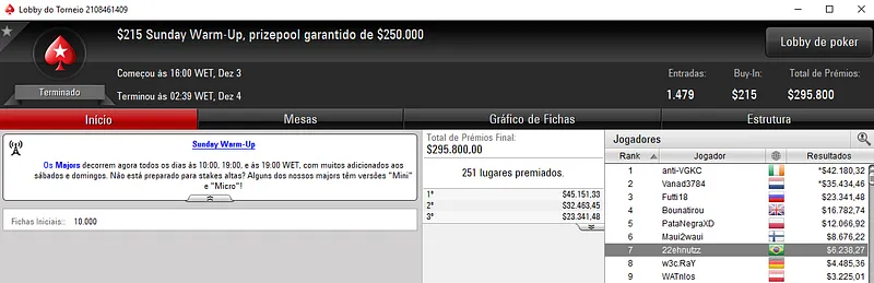 Já no $22 Mini Sunday Million dois jogadores brasucas ficaram no pódio. Pietro_MK e H.Seibel ficaram na segunda e terceira colocação, respetivamente, e forraram $15,532 e 15,483. Este torneio acolheu 10,230 entradas e o prize pool chegou aos $204,600.