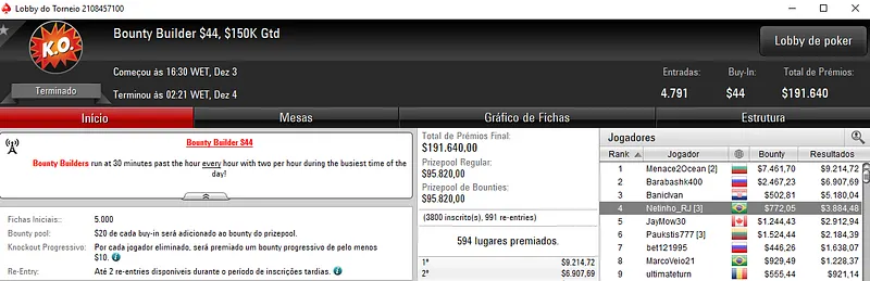 O $215 Triple Threat [3-Max,Turbo, Porgressive KO, Zoom] também contou com cravada brasileira. Com o título pcayobh levou para o caixa $14,150 de premiação entre os 352 participantes.