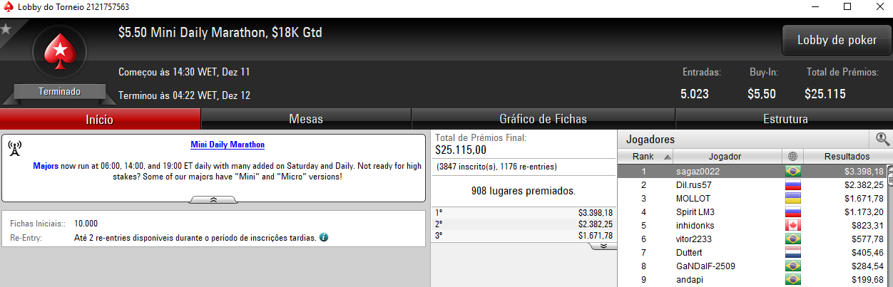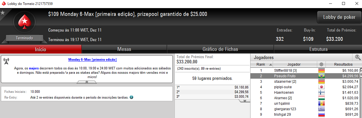 O maior prêmio apareceu no $22 Mini Monday com 3,839 registros e $76,780 de prize pool. O jogador verde e amarelo diogordgs forrou $8,101 depois de cair na terceira colocação e ter realizado acordo no 3-handed.