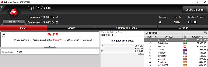 Já no Bounty Builder $44 a medalha de ouro veio mesmo para o Brasil, com rafitia a embolsar $8,731 de premiação. Este evento contou com 2,113 jogadores e o prize pool chegou aos €84,520.