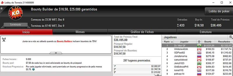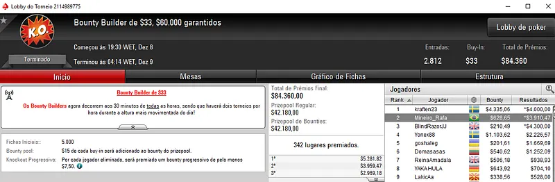 Já o Hot $22 teve a participação de 2,189 jogadores e o prize pool chegou aos $43,780. Com o título, EduCARAI! levou para a sua conta $5,866 de premiação. Na segunda colocação, Tayguera forrou $4,032.
