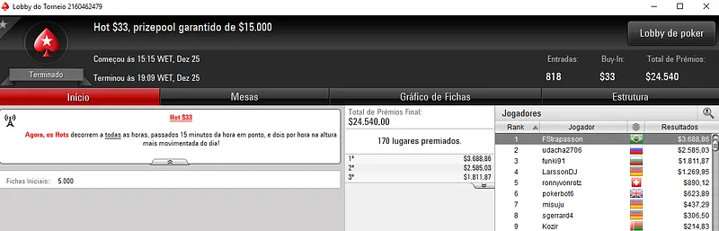 EdilsonRTJ cravou o Hot $215 com 291 jogaodres e levou para o caixa $11,064 de prêmio. O jogador brasileiro foi o melhor, mas na terceira colocação, cigarromata encaixou $5,944.