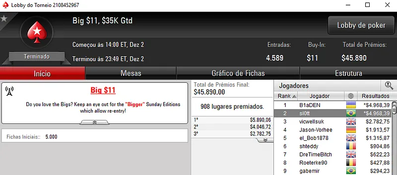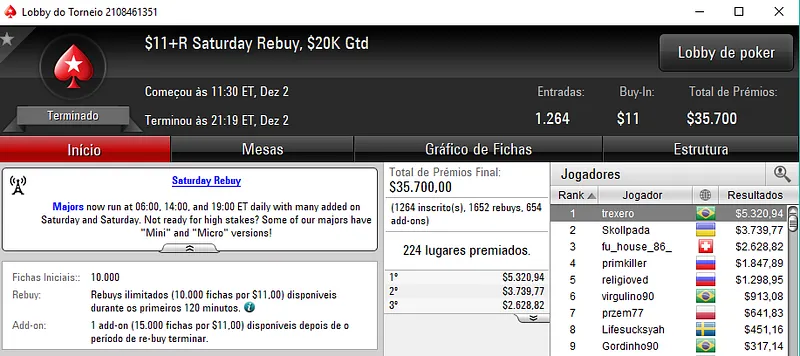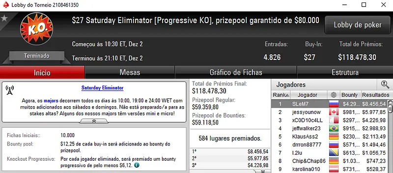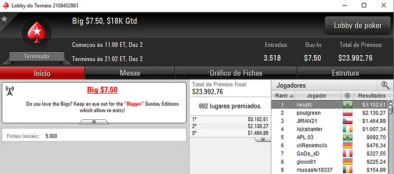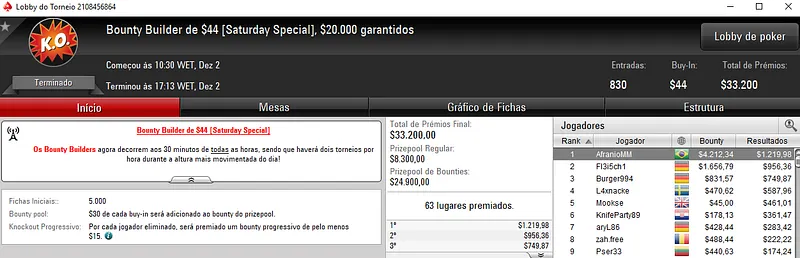 O maior prêmio foi para Danilo "nareee" Baeza que cravou o Bounty builder $162 para forrar $7,436 de prêmio. O torneio teve 293 jogadores me jogo e $43,950 de prize pool.