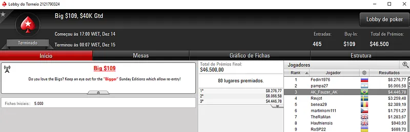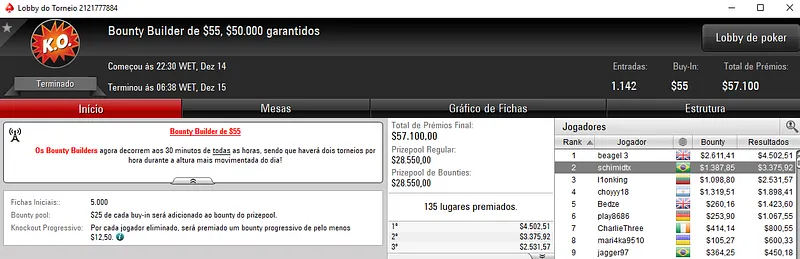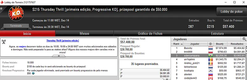 O jogador brasuca foi 2º classificado no $215 Fat Thursday [Turbo] com 319 jogadores e dividiu o prémio com NNNXX no heads-up. Assim, outsider_ooo embolsou $10,300 de recompensa.