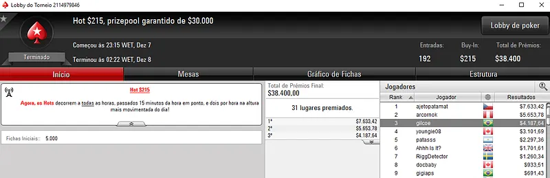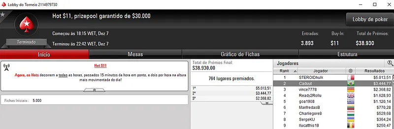 Já no Big $44 com 574 entradas, BrunoBoucas apenas perdeu no heads-up e embolsou $3,382 de prêmio, depois de chegar a acordo no duelo final.