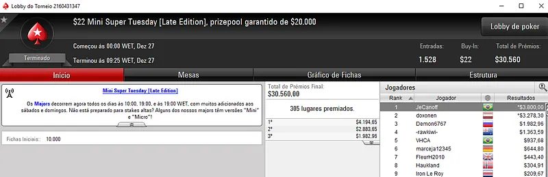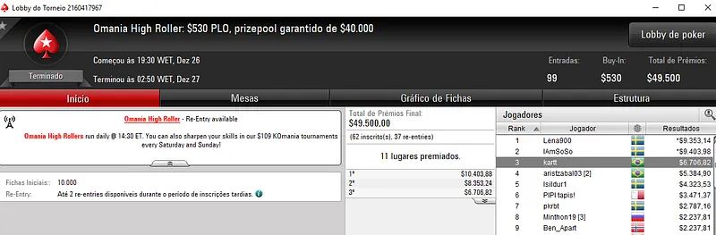Já no torneio especial do dia, o $215 Fat Tuesday teve a participação de 457 jogadores e Bernardo "Machadada RS" Rocha saiu com a medalha de prata. O jogador brasileiro só perdeu no heads-up e forrou $12,658 de premiação.