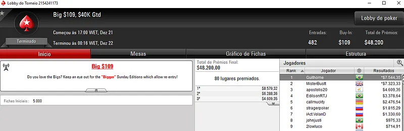 BERTIOGA12 é que não deu chances no $215 Thursday Thrill com 370 jogadores. O jogador verde e amarelo superou o field para embolsar $10,625 de premiação. Na quarta colocação, outsider_ooo recebeu $3,079.