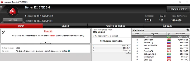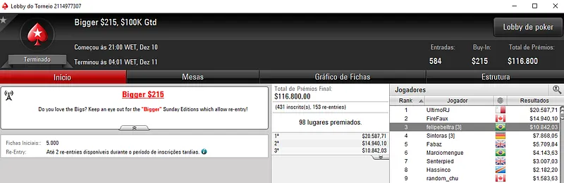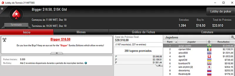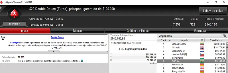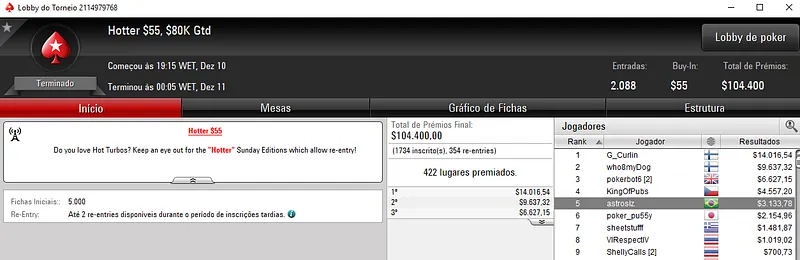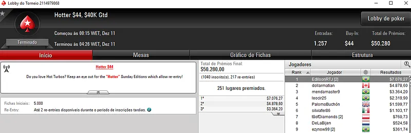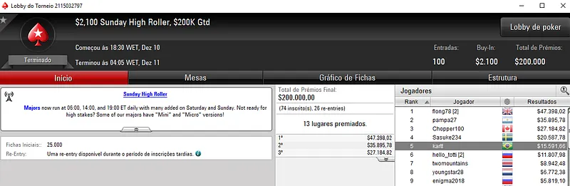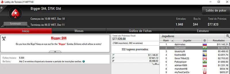 Já num dos maiores torneios do PokerStars, o $11 Sunday Storm, o Brasil voltou a receber uma medalha de prata. Desta vez, EduardoLTZ perdeu o para o finlandês miiga1986 e forrou $18,301, depois de chegar a acordo no heads-up