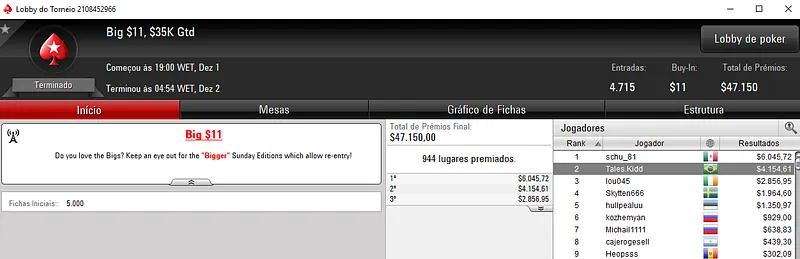 Noutro torneio do mesmo formato, o Bounty Builder $11 teve a presença de 6,732 jogadores e $67,320 de prize pool. Igor "igor.reisps" Reis foi o campeão e embolsou $5,976 entre prêmio e bounties.