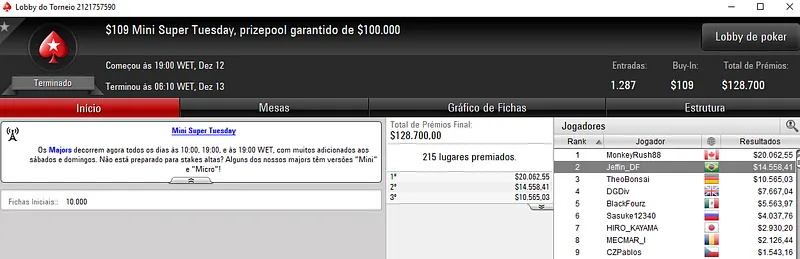 Já Jefferson "Jeffin_DF" Medeiros recebeu a medalha de prata no $109 Mini Super Tuesday e forrou $14,558. Este torneio teve 1,287 entrads e o prize pool foi de $128,700.