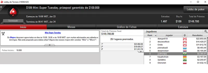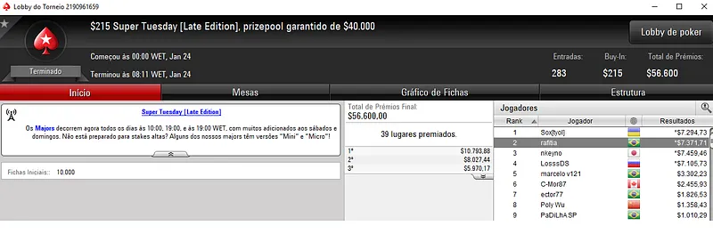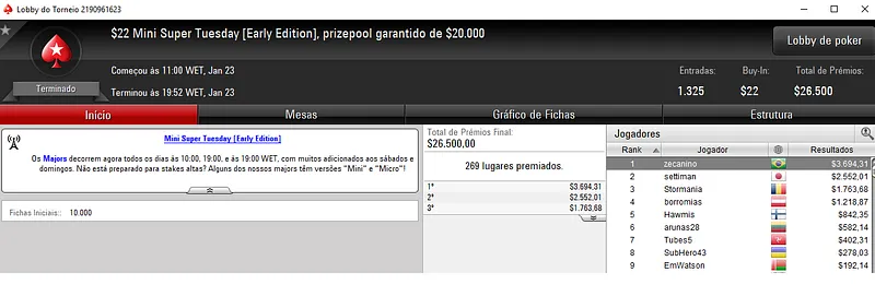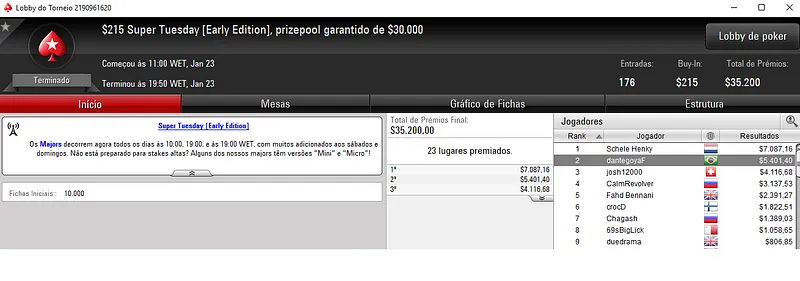O maior vencedor foi cigarromata que terminou o $1,050 Super Tuesday com 277 jogadores na 4ªcolocação. O jogador brasileiros embolsou $21,730 só neste evento.