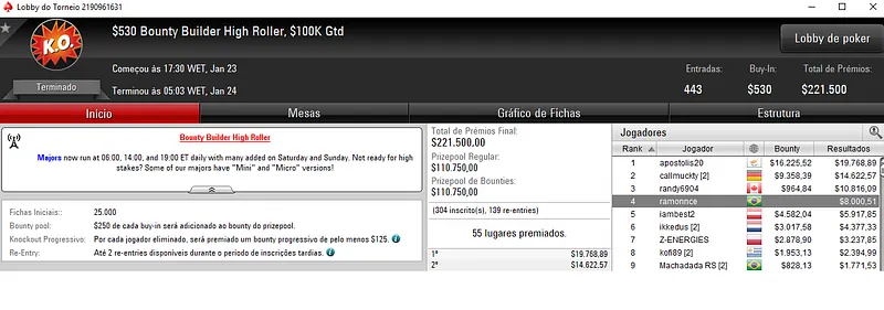 Caio "Pessagno" Pessagno também deu show e cravou o $215 Triple Threat com 221 entradas e $42,200 de prize pool. O craque forrou $9,823 neste evento.