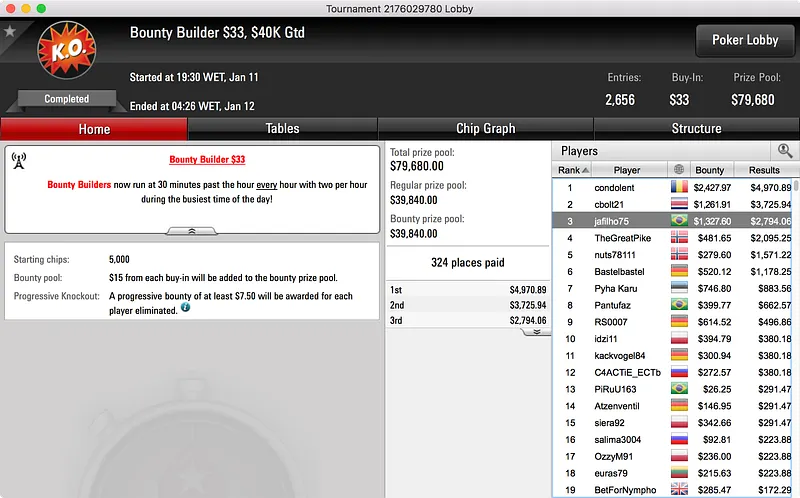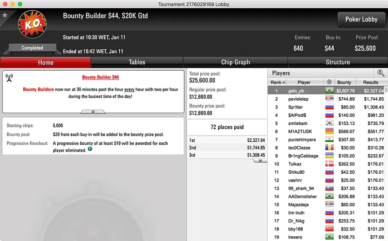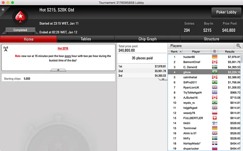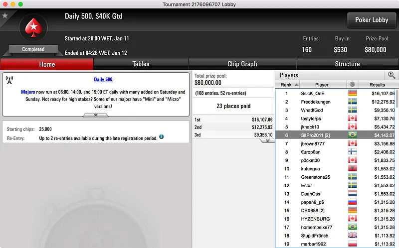 Novo dia, nova sessão com dezenas de Brasileiros mostrando ao mundo do Poker o que sabem sobre o jogo. Foram muitos os prêmios de quatro dígitos com cor verde e amarela e dois deles alcançaram mesmo os 5 dígitos.
