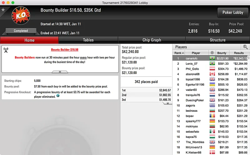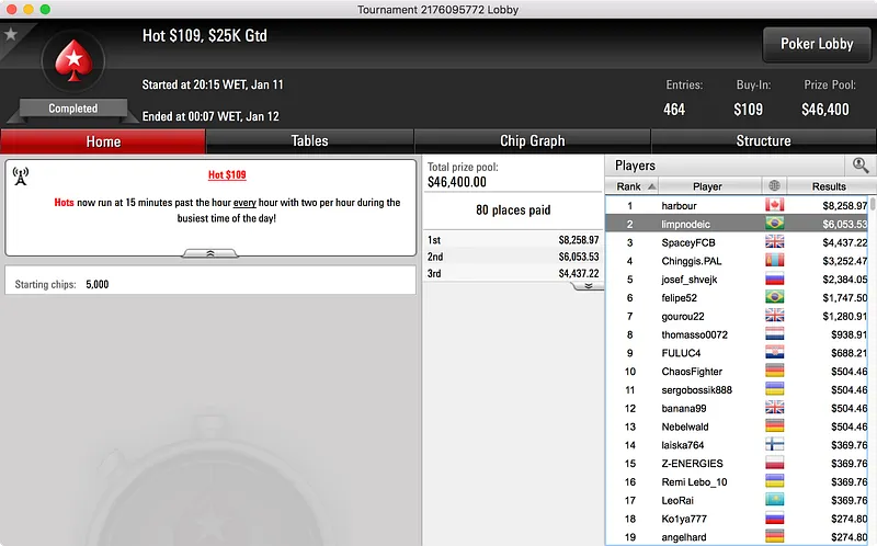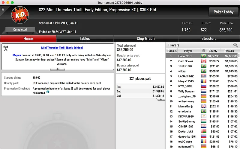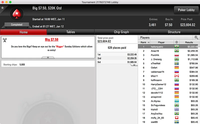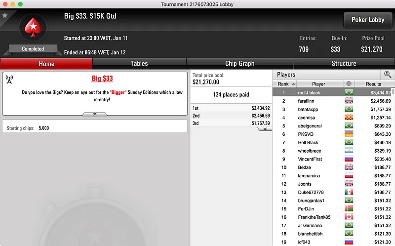 Por fim, mais uma cravada brasileira, dessa vez no Big $22. A edição de quinta-feira desse torneio viu 2.569 jogadores se registrarem o que totalizou $51.380 de prize pool que foram divididos por 440 jogadores. No final, o Brasileiro PV_PKS derrotou o Grego kris_r9 (2º - $6.145) após efetuarem um acordo que dividia em partes quase iguais os cerca de $12.000 que estavam em jogo. PV_PKS levou assim $6.069 pela vitória e marcou seu nome na história dessa quinta-feira.