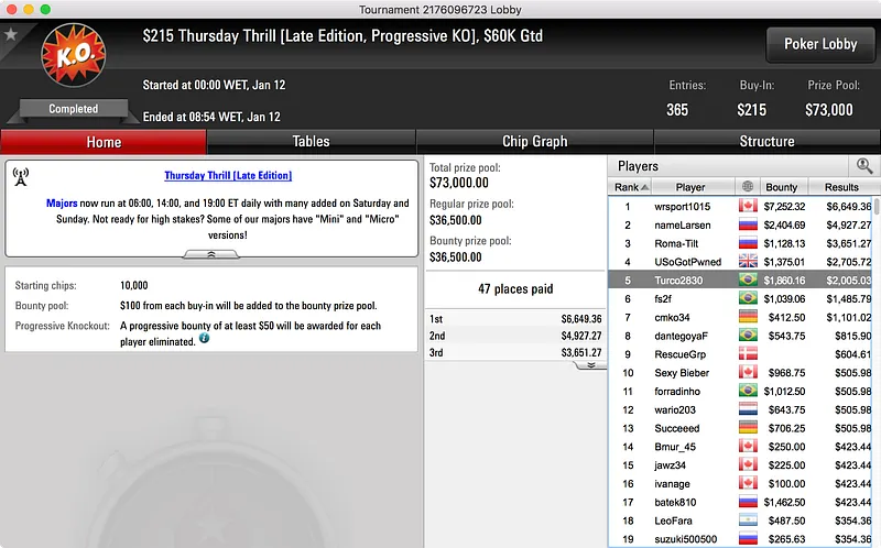 Foi no $1.050 Thursday Thrill que foram alcançadads as maiores premiações do dia. O torneio contou com 317 entradas registradas, o que resultou num prize pool de $317.000 que foi dividido por 39 jogadores. Apesar dos mais de $60.000 que o campeão levou para casa terem fugido, a mesa final contou com duas presenças brasileiras. Reyals_rs alcançou o 4º posto e embolsou $13.487 e, wendellau chegou mesmo no pódio alcançando a medalha de bronze. Por sua prestação, wendellau embolsou $23.994, o maior prêmio brasileiro do dia.