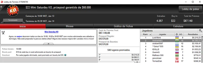 Quem também forrou pesado foi ManafesTT que saiu com $6,546 no $215 Saturday KO. O jogador brasuca terminou na terceira colocação entre os 628 participantes, que perfizeram um prize pool de $125,600.