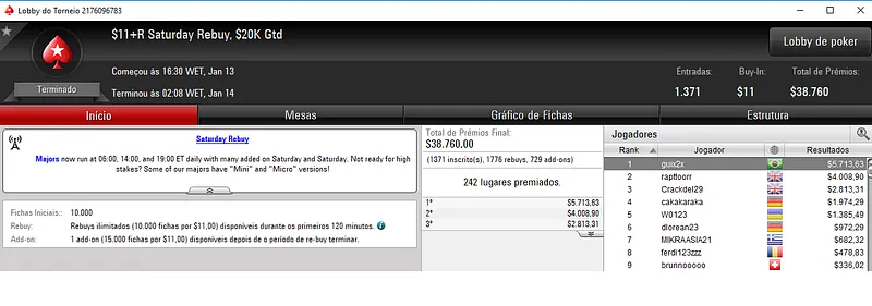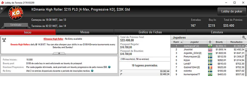 Já goiaba25 foi o campeão do Hot $22 com 2,402 jogadores. O grande field não meteu medo ao jogador verde e amarelo que embolsou $6,367 de premiação.