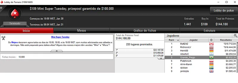 O grande torneio do dia, o $1,050 Super Tuesday contou com 291 entradas e o prize pool total chegou nos $291,000. O jogador brasileiro FERRIS243 não conseguiu vencer o torneio mas terminou na segunda colocação para receber $41,271 de premiação. Ele apenas perdeu no heads-up para a estrela Dominik "Bounatirou" Nitsche.
