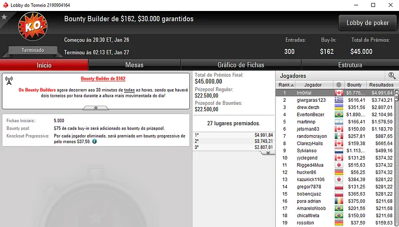 Já no Bounty Builder $33, antoniolan deu a cravada e embolsou $4,738, entre premiação e bounties. O jogador brasuca deixou todo o mundo comendo poeira e levou o título no torneio com 1,076 participantes.
