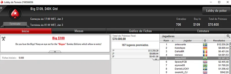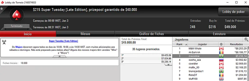 O maior vencedor da reta foi Pelckito que cravou o $215 Fat Tuesday com 48 entradas e $89,600 de prize pool. Os prêmios foram divididos pelos 72 melhores classificados e o jogador brasileiro encaixou $16,934. Na quinta colocação Pedro "ToninhoBet" Marte ainda forrou $4,838.