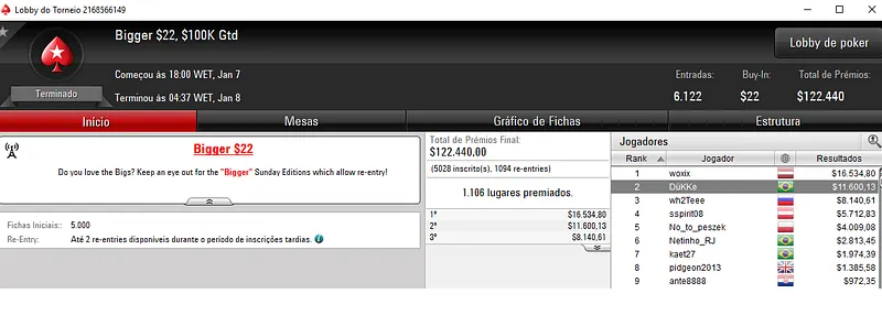 Felipe "hipowrock" Bozetti foi vice no Bigger $109 para receber $19,683 de premiação. Este evento contou com 1,834 entradas e o prize pool chegou aos $183,400, com o jogador brasuca a perder apenas para o austríaco schemette.