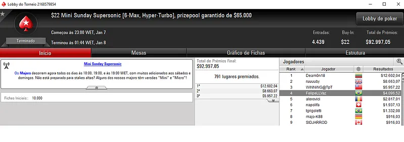 Um dos maiores campeões do dia foi Wendel "wendellau" Lauterte que cravou o $22 Mini Sunday Million com 8,864 jogadores. Com o título, Wendel embolsou $22,558 de premiação entre os $177,280 de premiação garantida.