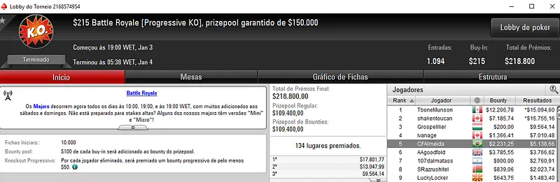 O Bounty Builder $109 contou com 1,223 participantes e renBR apenas perdeu o torneio no heads-up contra youknowiknow. O jogador brasileiro foi recompensado com $9,637 de premiação pelo excelente desempenho.