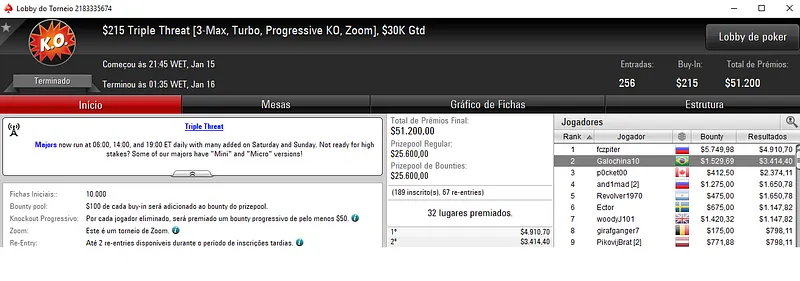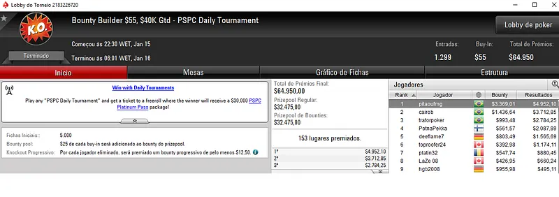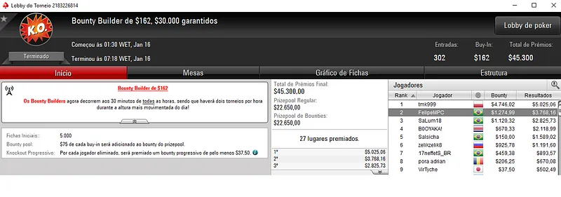 Júnior "Melo Jr" Melo foi o nosso melhor representante na sala da espada vermelha. O jogador brasileiro cravou o Bounty Builder $215 e levou para o caixa $13,688 de premiação. Este evento contou com 312 jogadores e um prize pool de $62,400.