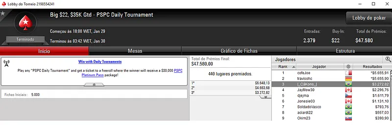 O $22 Mini Monday [6-Max] com 4,267 entradas assistiu à cravada brasuca de Nangino89 que embolsou $9,597. O jogador brasileiro acabou recebendo essa premiação depois de realizar acordo no heads-up com Milosko87. Este torneio teve um prize pool de $85,340.