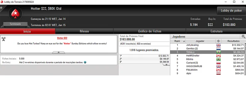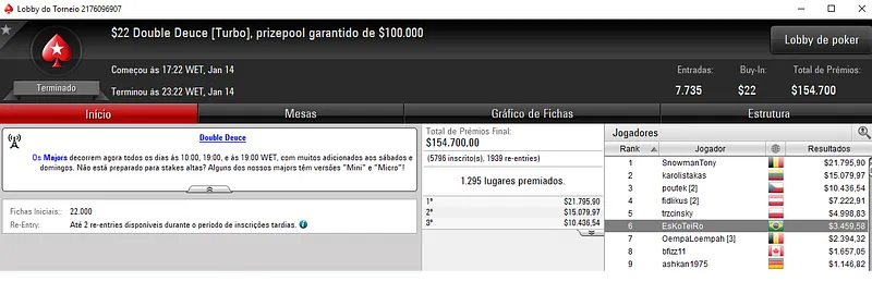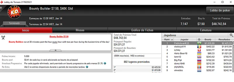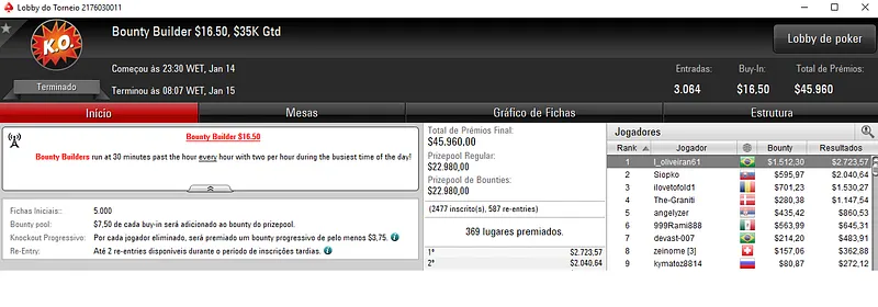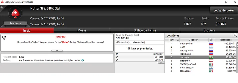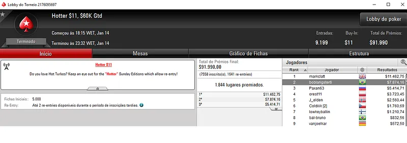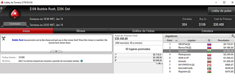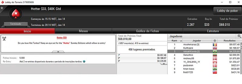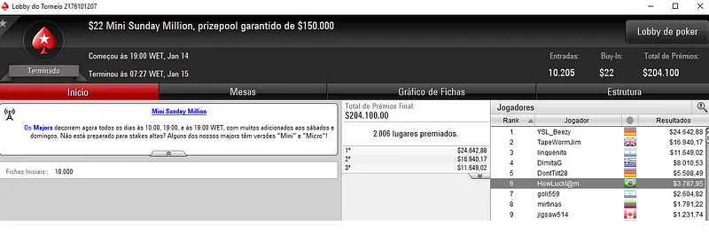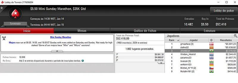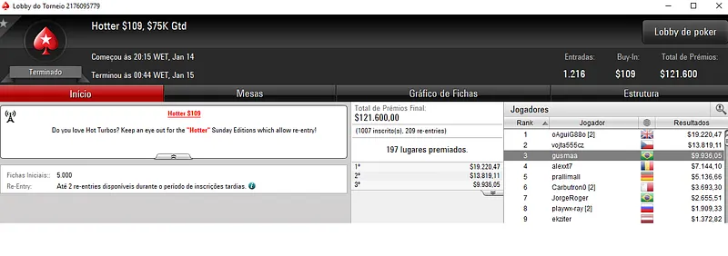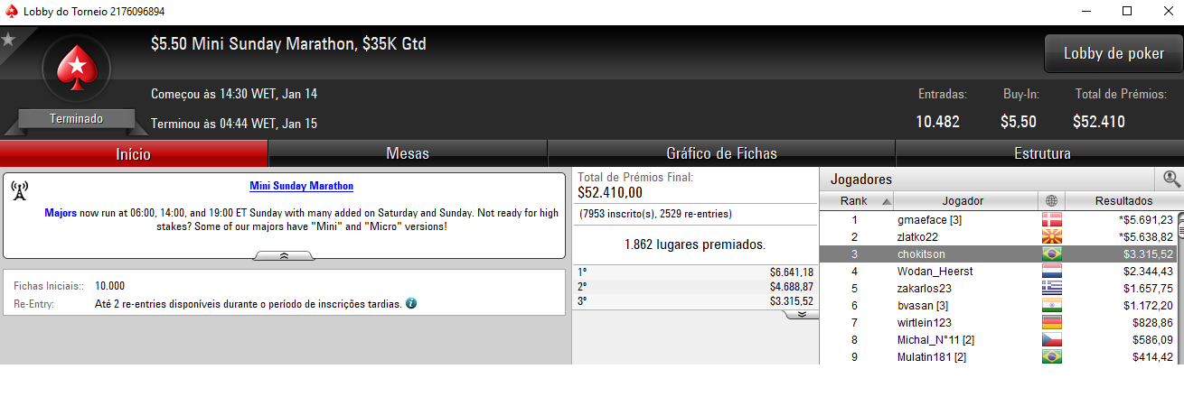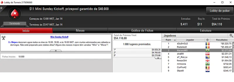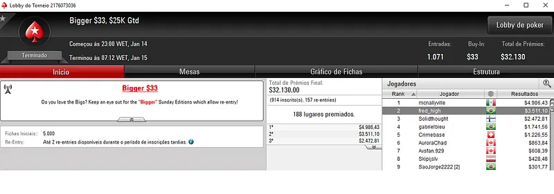 A dobradinha verde e amarela apareceu no $10,000 Payday, onde sergiofpkr cravou $15,124 no primeiro lugar. A segunda posição ficou para bertola12 que faturou $10,805. De notar que este evento teve a participação de 1,453 jogadores, o que se traduziu num prize pool de $117,500.