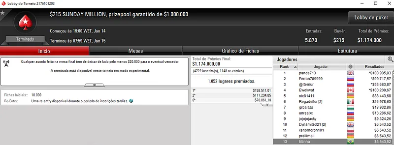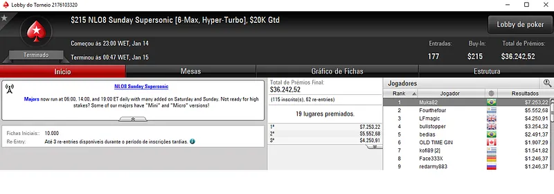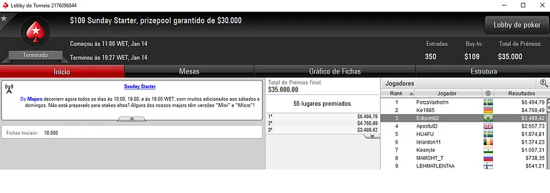 O grande vencedor verde e amarelo foi Pedro "peterwhooo" Correa que cavou o $215 Sunday Warm-Up para embolsar $42,329 de premiação. O evento contou com 1,374 jogadores e o jogador brasuca deixou todos apanhando pó. Já na mesa final, João "Ruis Maker" Ruis terminou na quinta colocação e forrou $11,312, enquanto Pedro "PaDiLhA SP " Padilha ficou em 9º e levou $3,023.