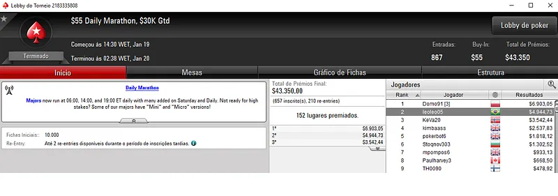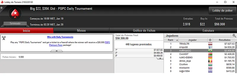 Já no Bounty Builder $162, Regis R69 deu a cravada e embolsou $10,413. Este torenio teve a aprticipação de 320 jogadores e o prize pool chegou nos $48,000.