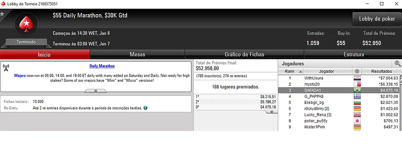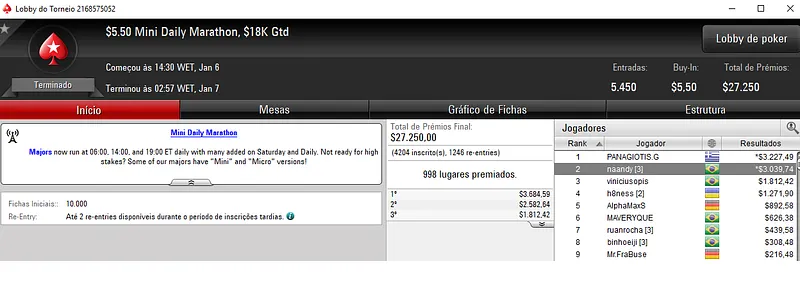 Já no Bounty Builder $33 houve dobradinha brasuca. Com o título, a1.e4 encaixou $8,847, enquanto a segunda colocação deu $4,743 a toddy.Jm. Este torneio teve 3,168 jogadores e $95,040 de prize pool.