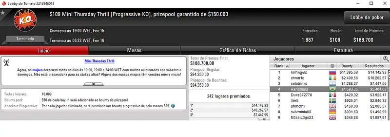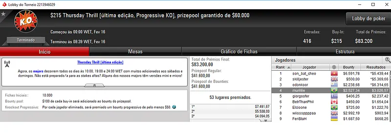 Diego "Mr.Bittar" Valadares foi o protagonista da maior forra do dia. O jogador brasileiro foi segundo classificado no $1,050 Thursday Thrill com 302 entradas e $302,000 de prize pool. Pela medalha de prata encaixou $28,214 de premiação.