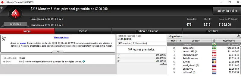 Drudz777 e betoeco13 Dividem Prêmios no $215 Monday 6-Max & Mais
