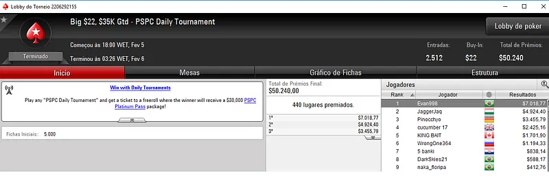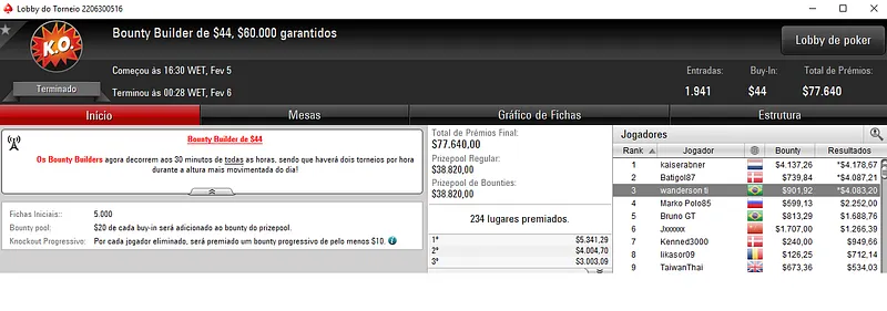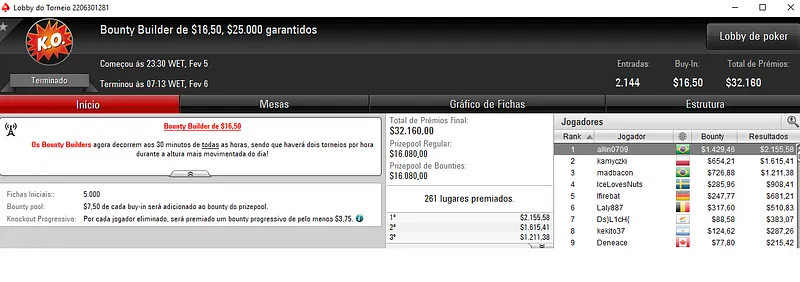 Já no Bounty Builder $109, torneio com 1,133 participantes e $113,300 de prize pool, dois jogadoers verde e amarelos chegaram no pódio. Com a medalha de prata, limpnodeic forrou $8,799, enquanto Douglas "Dowgh-Santos" Ferreira recebeu $6,474 na terceira colocação.