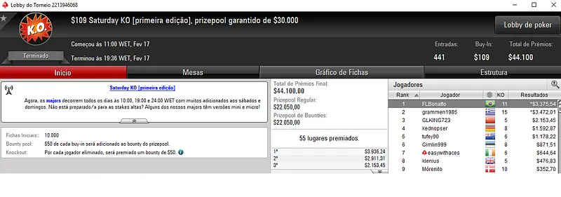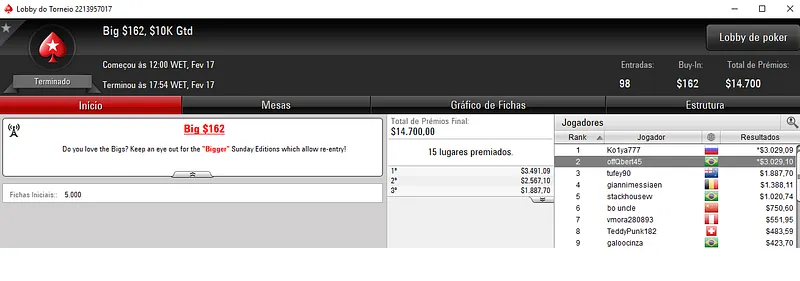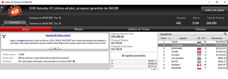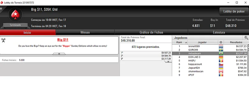 O grande vencedor foi aluizlima que depois de deixar para trás 1,543 oponentes encaixou $9,583 de premiação no Bounty Builder $55.