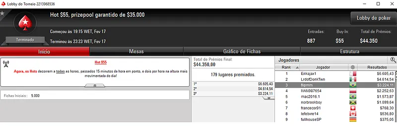 O Hot $22 acolheu 2,219 jogadores e viu ViniSaliba sair com o título, depois de dividir a premiação no heads-up. O triunfo valeu $5,247.