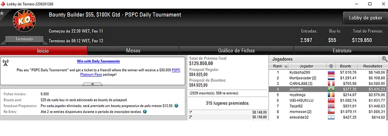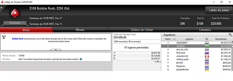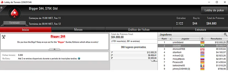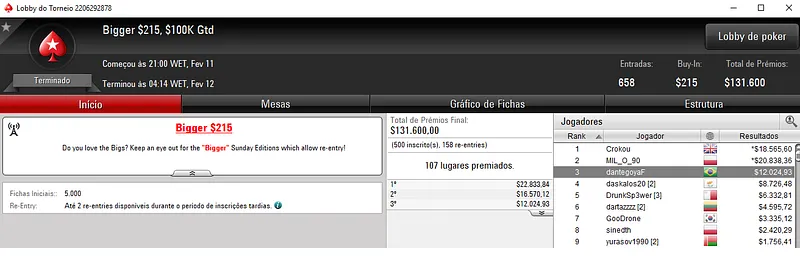 Mesmo com acordo no 3-handed, Geraldo "GeraldoCesar" Cesar Neto embolsou $22,844 pelo título no Bigger $109. Este torneio contou com 1,927 entradas que perfizeram um prize pool de $192,700.